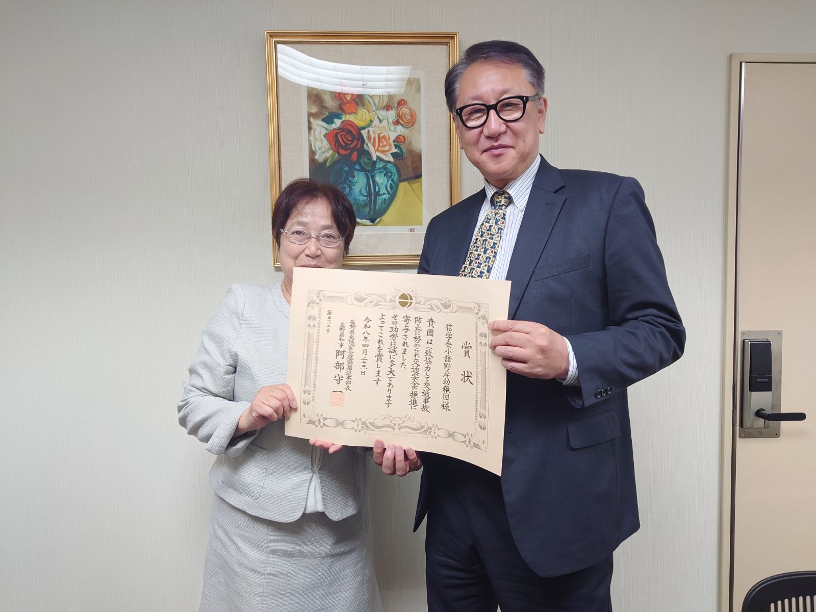 この度、信学会小諸野岸幼稚園が、県下で9団体が選ばれる「交通安全功労団体」として、長野県交通安全推進本部顕彰を受賞いたしました 。